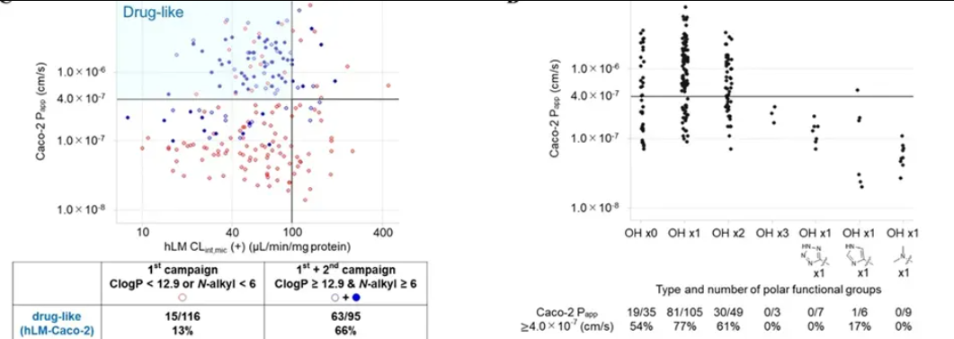 本文将“药物性质”定义为可接受的代谢稳定性和膜渗透性,并分别用体外肝微粒体实验和Caco-2渗透性实验对文库中的肽进行评估。初步评估表明,含有11个残基的环肽符合药物性质标准的比例最高。此外,作者进一步发现,Clog P大于12.9和N-烷基化多于6个对药物性质具有显著贡献(见图2)。在极性和带电基团方面,研究结果表明,存在3个羟基或一个带电基团会显著降低环肽的膜渗透性。最终,作者证实了上述筛选得到的药物环肽确实具有较好的口服生物利用度和体内分布,从而强化了前述结论的可靠性。