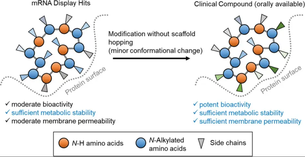 然而,除了Lipinski的药五原则(Rule of Five),人们对分子量大于500 g/mol的中等尺寸环肽的药物性质缺乏系统性的了解。因此,目前筛选出的多肽类先导化合物往往在药物性质方面表现不佳,在后续的药物性质优化过程中,存在活性丧失的风险。中外制药株式会社(下称中外制药)针对这一问题,通过详细阐述类药环肽的结构特征和理化性质,系统性总结环肽药物性质的潜在参考标准,对多肽药物研发者具有一定借鉴意义。中外制药通过其构建的环肽文库,成功针对细胞内一度被认为是不可靶向的靶点KRAS,设计并获得了具有强效口服潜力的环肽。近日,该研究工作发表在美国化学会出版的Journal of the American Chemical Society期刊(J. Am. Chem. Soc. 2023, 145 (44), 23891-24436)【1】。